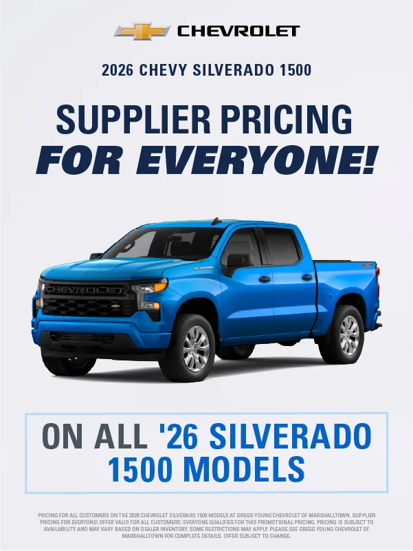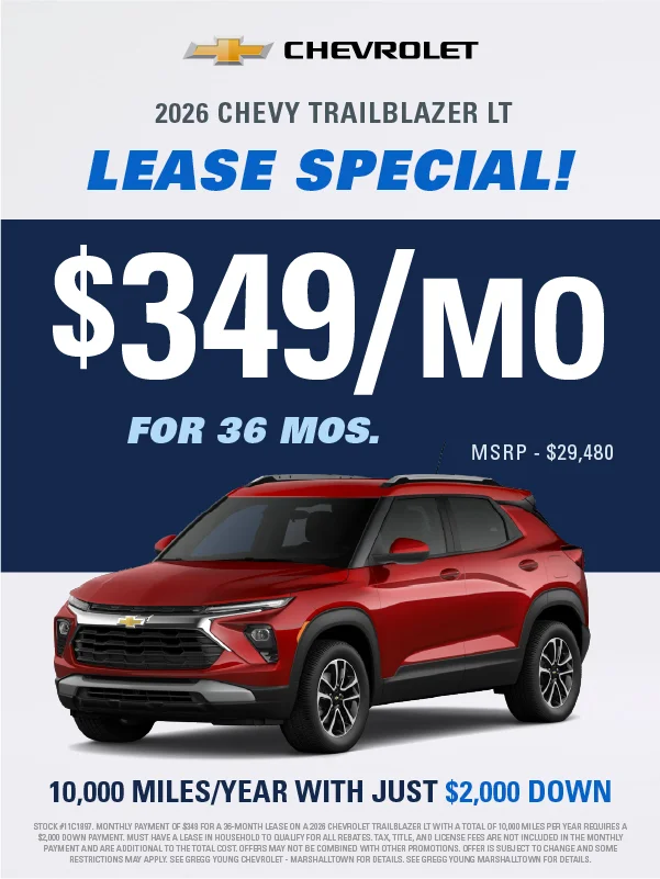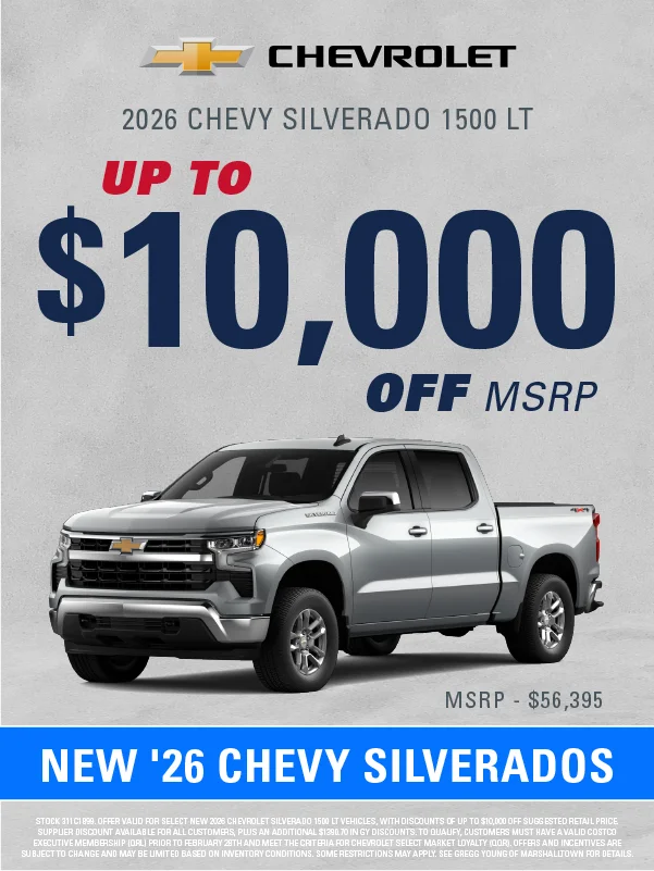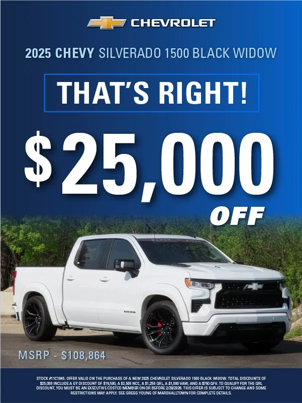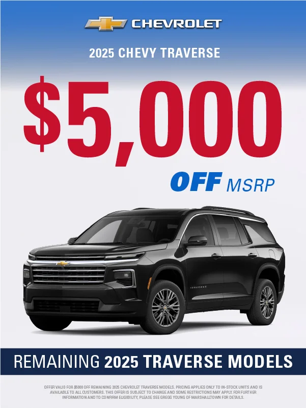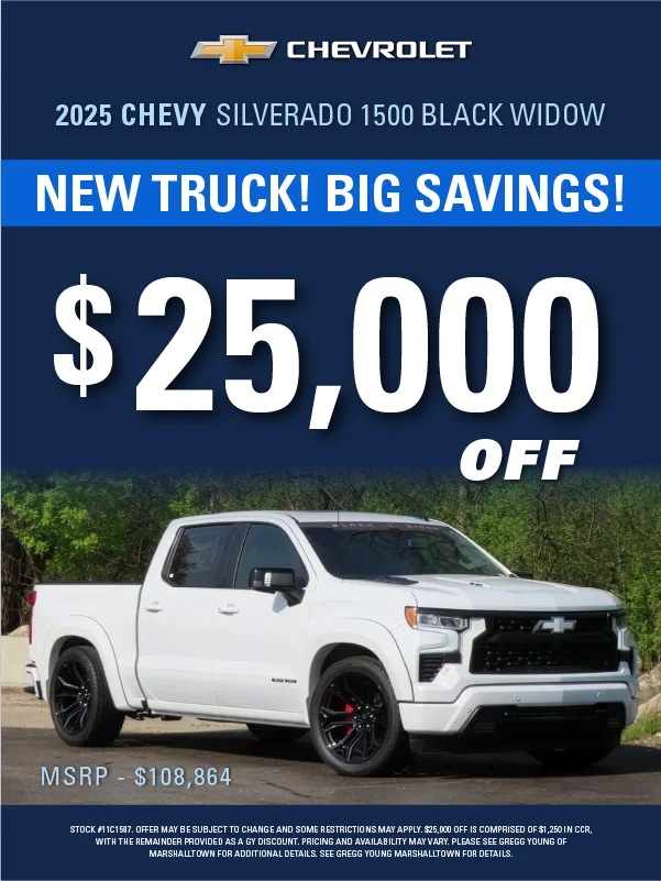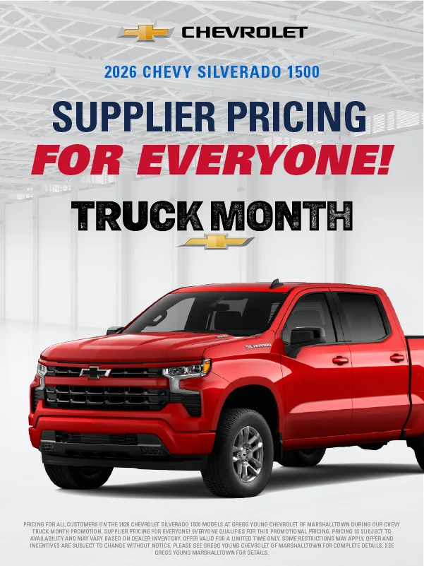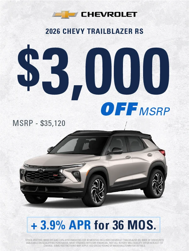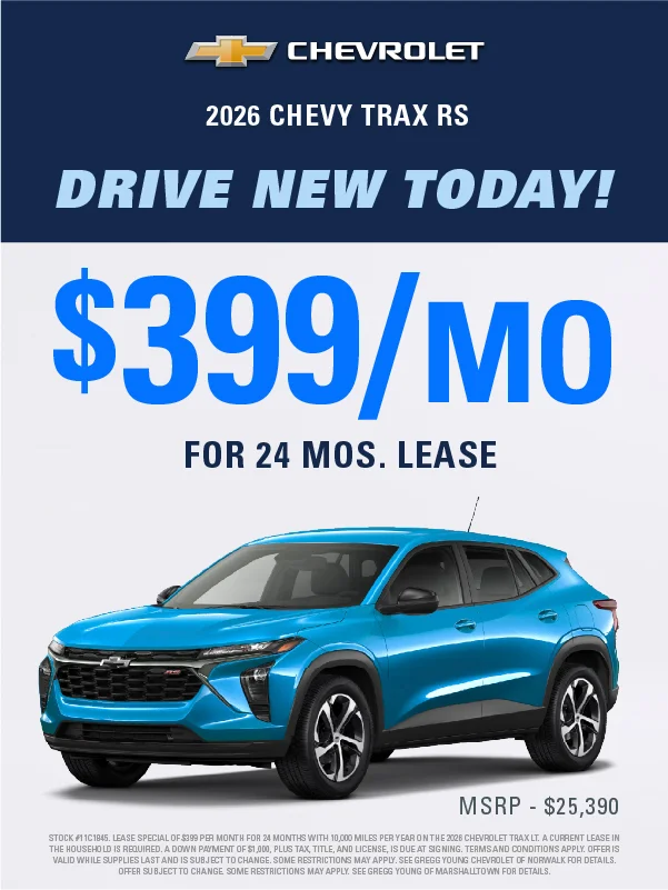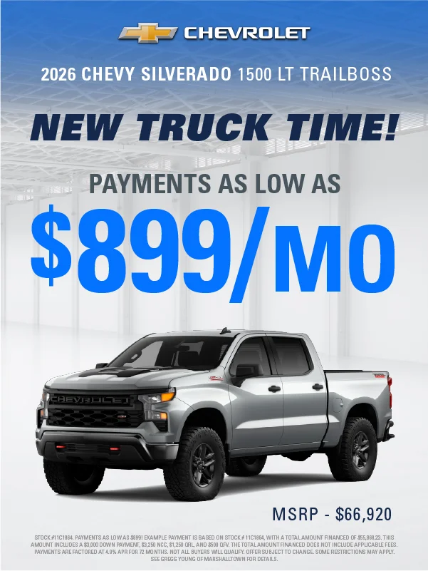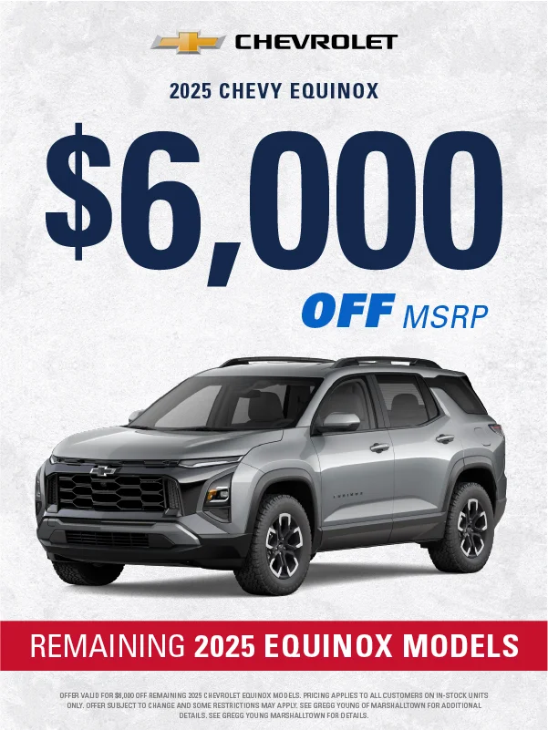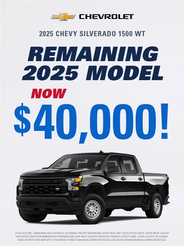 At Gregg Young Chevrolet Marshalltown, we’re proud to be your local Chevy dealer in Central Iowa, offering a full lineup of new Chevrolet cars, trucks, and SUVs, plus a wide range of used and certified pre-owned vehicles. Conveniently located on South Center Street, we proudly serve drivers from Marshalltown, Ames, Newton, and nearby communities with a hometown experience backed by big-city value.