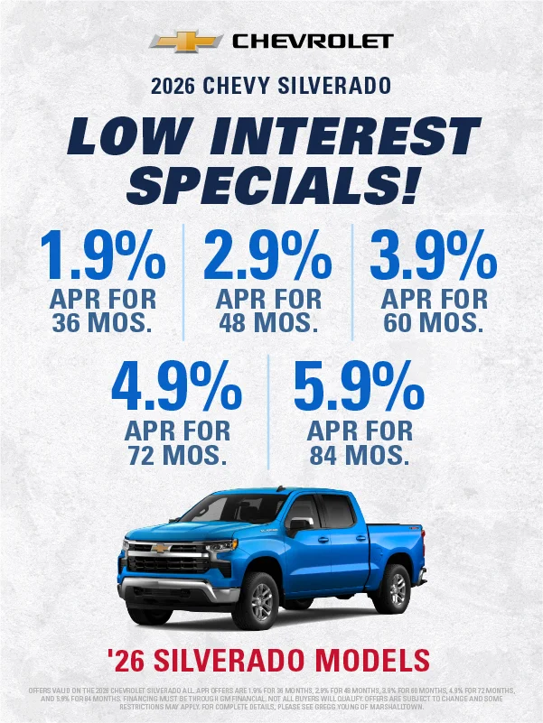 Welcome to Gregg Young Chevrolet Marshalltown, your hometown destination for new Chevy vehicles, affordable used cars, and certified auto service in Marshalltown, Iowa. Conveniently located on South Center Street, our dealership proudly serves Marshalltown, Ames, Newton, Des Moines, and surrounding Central Iowa communities.